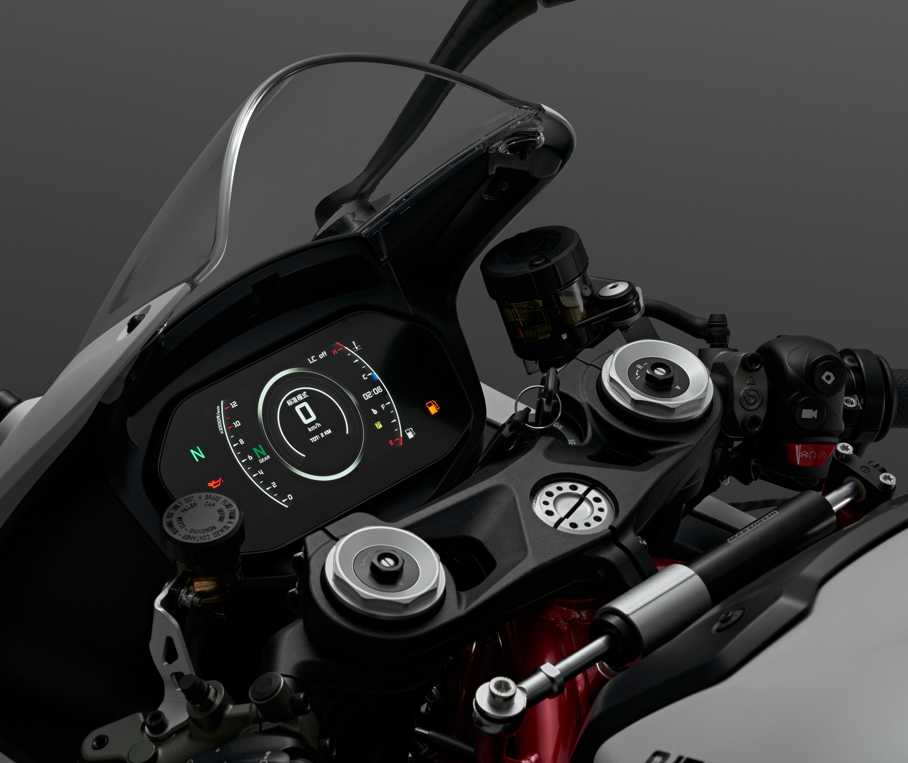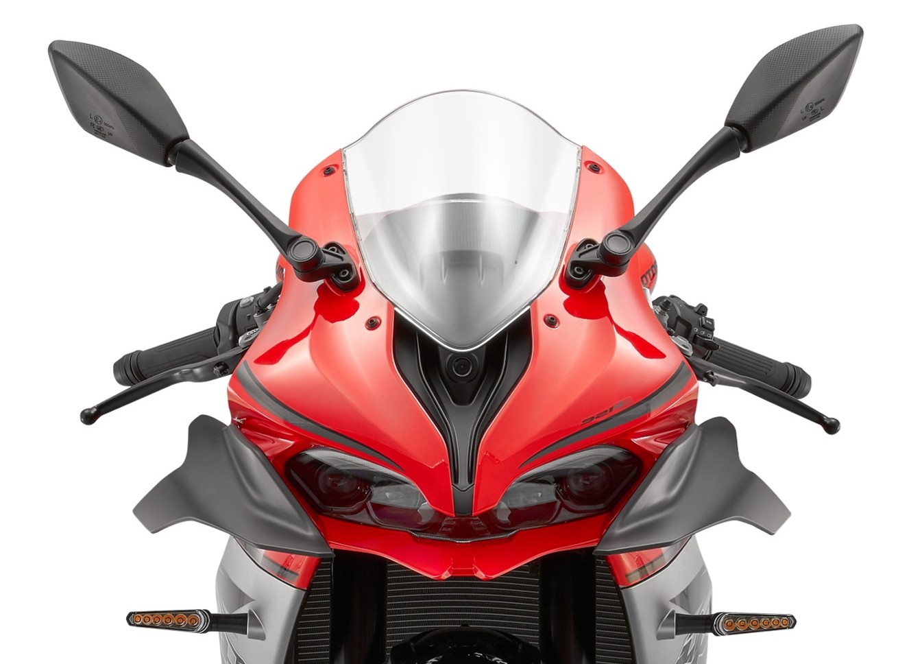 SRK 921 RR’s design er resultatet af samarbejdet med C-Creative i San Marino – et studie kendt for at skabe ikoniske superbikes med italiensk finesse. Den har en trellis-stelramme med støbt bagramme, en enkeltsidet svingarm og aerodynamiske winglets, der både forbedrer stabilitet og tilføjer et visuelt statement af fart og kraft. Quad-LED projektorforlygter og en markant bagende fuldender udtrykket af moderne superbike-design.